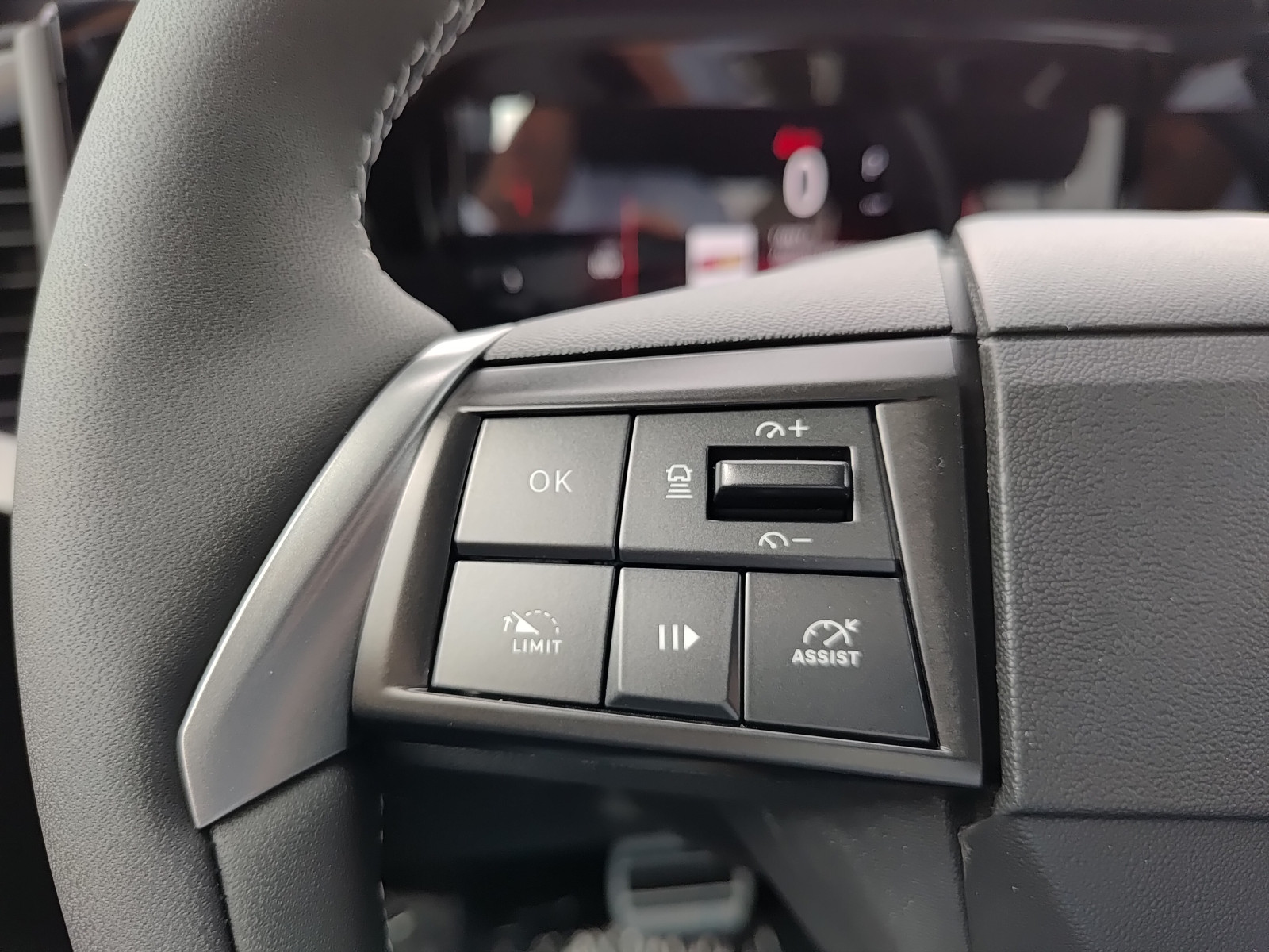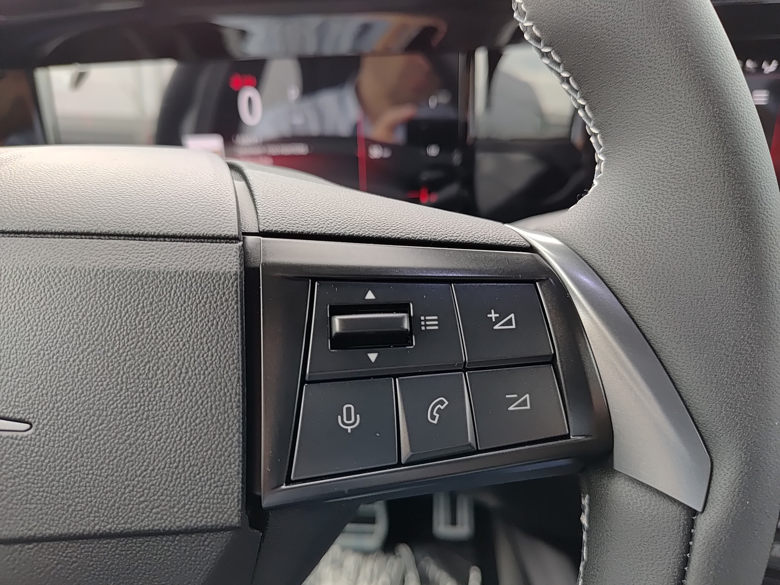 Sportowe koło kierownicy pokryte skórą ekologiczną, spłaszczone u dołu, z przyciskami sterowania