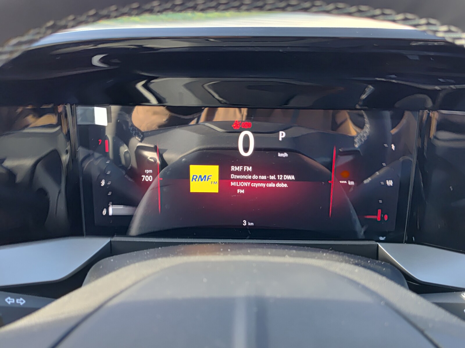 Sportowe koło kierownicy pokryte skórą ekologiczną, spłaszczone u dołu, z przyciskami sterowania