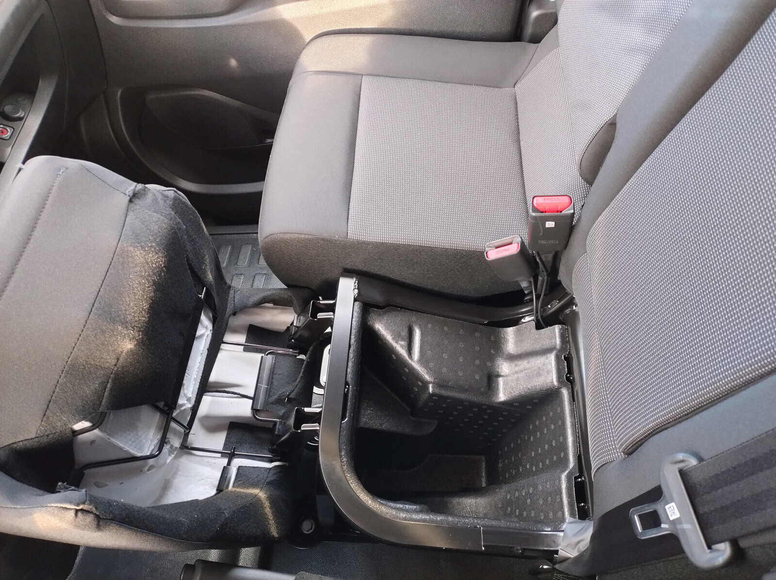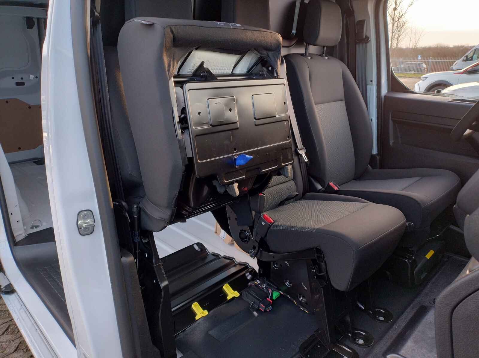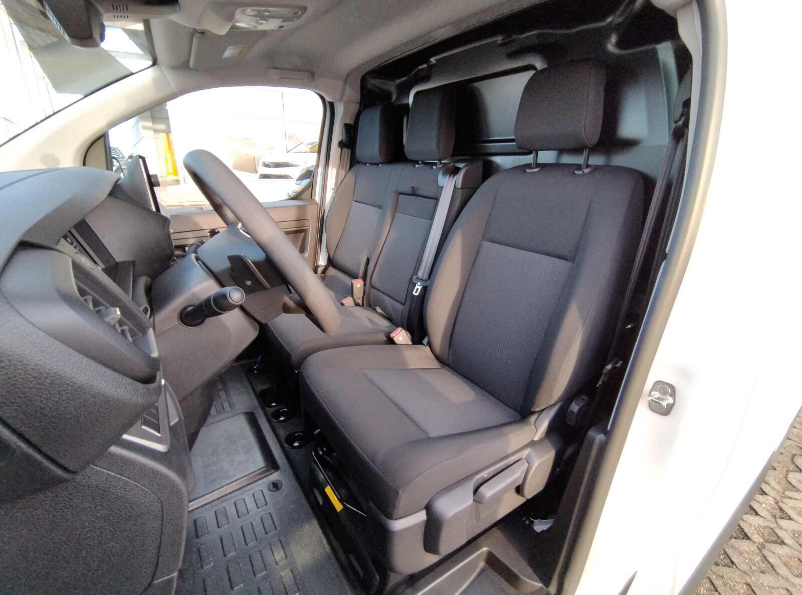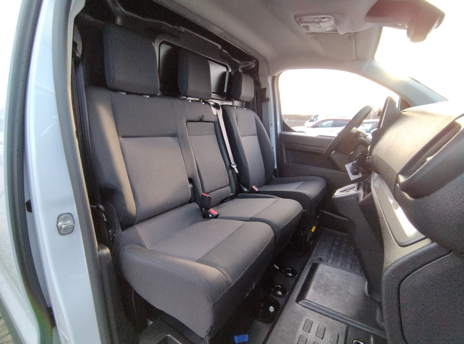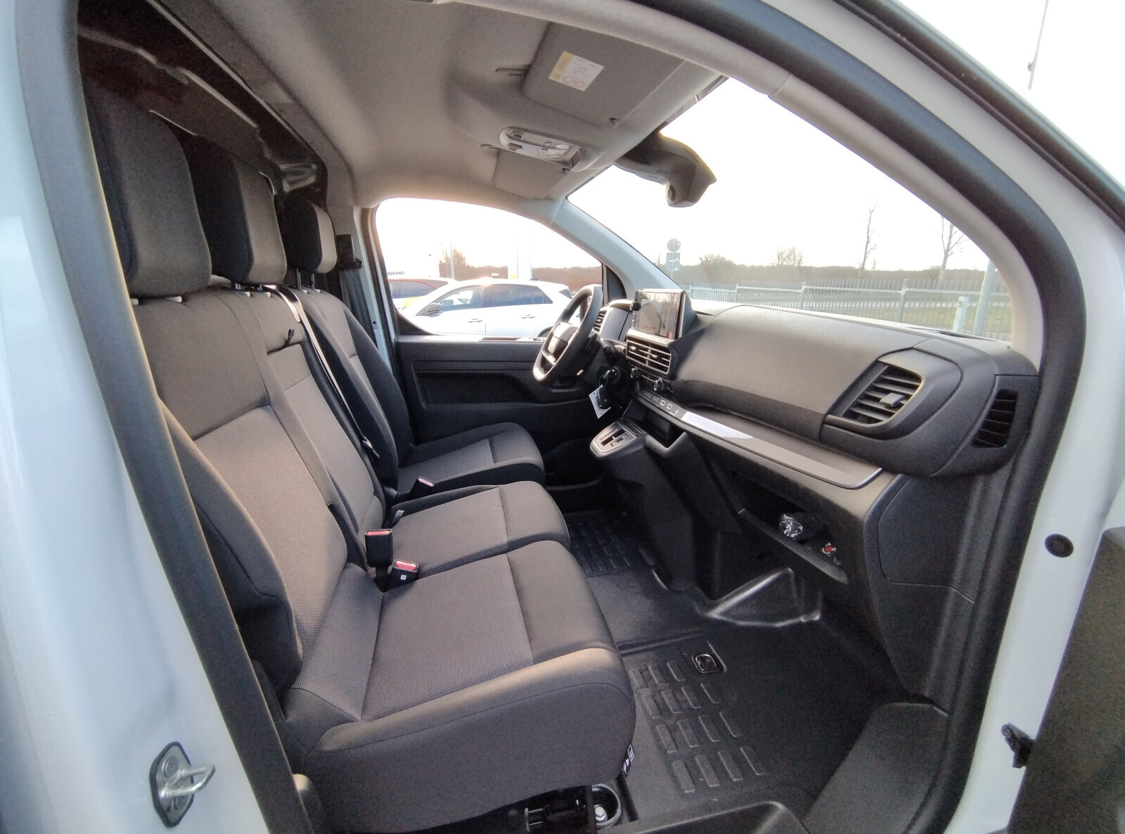 Fotel kierowcy z podłokietnikiem, dwumiejscowa kanapa pasażerów ze schowkiem pod siedziskiem, regulacja fotela kierowcy: wzdłużna, oparcia, wysokości, odcinka lędźwiowego